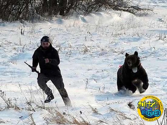警察不停变线奔跑,试图摆脱棕熊追逐。