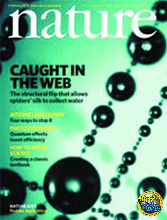 在有雾的早晨,蜘蛛网会闪闪发光,这表明它们能以很高的效率从潮湿空气中收集水滴。对草间的蜘蛛网所做的一项研究显示,这种能力取决于蜘蛛网湿了之后所发生的一个结构变化。“湿后重构”的纤维以周期性纺锤节为特征,后者由随机的纳米纤维构成,被排列整齐的纳米纤维节点分隔开。这种结构在纺锤节和节点之间产生一个表面能量梯度,并在作用在与纺锤节或节点相接触的水滴上的压力上产生一个差别。这样可以确保水能在节点周围不断凝结,然后被输送到纺锤节上,在那里它能积聚成悬挂起来的大水滴,如本期封面所示。模仿变湿的蛛丝结构的一种人造丝也能从薄雾中收集水滴。