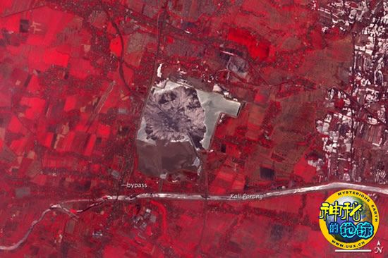 2006年5月29日,印度尼西亚东爪哇诗都阿佐地区一个天然气钻井发生事故,大量炽热泥浆喷涌而出,形成了灾难性的“泥火山”,淹没了附近大片田野和许多村庄。尽管印尼政府采取了多种措施对泥火山进行封堵,但泥浆仍旧继续不断喷出,形成了世界上最大的、增长速度最快的泥火山。2009年10月20日,美国宇航局“陆地”卫星飞越泥火山上空,卫星上的“先进星载热辐射与反射辐射计”捕捉到泥火山泥浆喷发的情景,并形成了这幅伪色合成图。