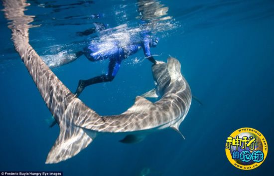 据《每日邮报》报道,虎鲨和大白鲨是两种令人望而生畏的大型海洋食肉动物,凶猛异常,攻击性强,但两名自由潜水爱好者却完全不设防,分别在南非海岸和东太平洋与虎鲨和大白鲨近距离接触,在他们眼中,鲨鱼其实“很含羞”。
