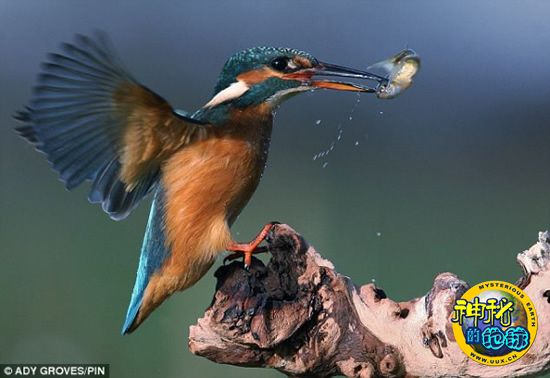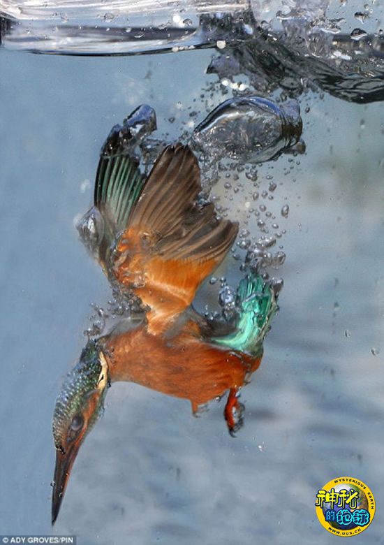 英国一名业余博物学家“诱骗”翠鸟从空中高速俯冲,捕食水中的小鱼,从而捕捉到这种美丽的鸟儿精彩的捕食照片。