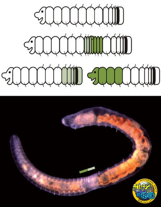 沿岸拟仙女虫(Paranais litoralis)在自行繁殖区(图中绿色部分)长出第二个头部和第二个尾部,然后进行分裂,来进行繁殖。如果新的头部在形成初期被切断,这种蠕虫就可以再生。