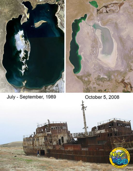 咸海位于哈萨克斯坦和乌兹别克斯坦两国境内。从图中可以看出,从1989年到2008年间,巨大的咸海已萎缩了数倍,大部分水域已干涸。人们不禁要问,这个巨大的水域是如何变成沙漠的?为什么会变成这样?下图中这艘被遗弃的大船也曾经在咸海中乘风破浪,它的搁浅向人们生动地展示了咸海的萎缩过程。自从20世纪60年代起,咸海的上游支流都被苏联人改变流向,将河水用作苏联的农田灌溉工程,因此咸海日渐萎缩并干涸。咸海曾经作为世界上第四大内陆咸水水体,如今只剩下原来水域面积的10%,而当地原来发达的渔业现在也已基本销声匿迹。当地生态系统也已遭到了毁灭性的打击,干涸的海床上覆盖着一层盐尘和有毒化学物质。这些化学物质大都来自武器试验、农药、工业项目和化肥流失等。