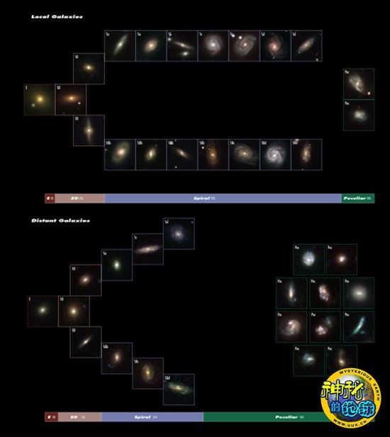 60亿年前的哈勃序列与如今天文学家所看到的哈勃序列完全不同。两个不同的片断显示,遥远的星系中有许多奇形怪状的成员,比本地临近星系要多得多。这个数据组织图是根据爱德文-哈勃于1926年所发明的哈勃音叉分类表得到的。本图上半部分显示的是本地临近星系的分类情况,而下半部分显示的是遥远星系的分类情况,其中包括许多奇形怪状的成员。