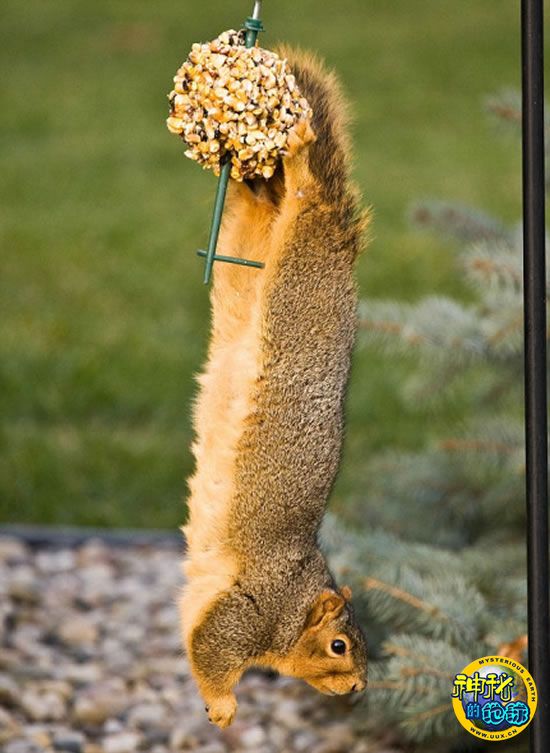 美国密歇根州的詹姆士·菲尔普斯在自家后花园设置了喂鸟器,他说:“它们在这里获得很多食物,因此它们变得很胖。它们设法爬到喂鸟器上,呆在上面吃东西,这种场面非常有趣。这只松鼠正在设法爬上喂鸟器,但是由于没抓紧金属丝,它从上面重重地跌落下来。然而它们的决心很大,不会被这种小挫折吓倒。”