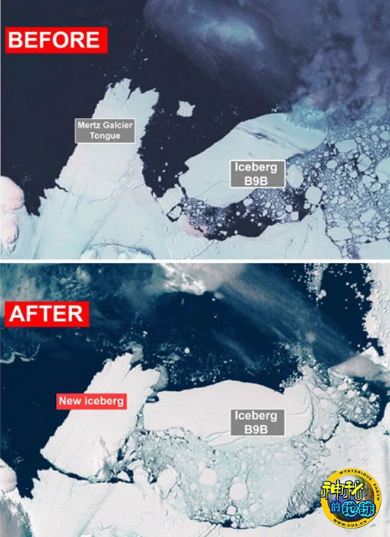 由于受到较老的“B9B”冰山的撞击,一座新冰山于2月份从莫兹冰河舌上崩离出来。这是崩离前后的对比图