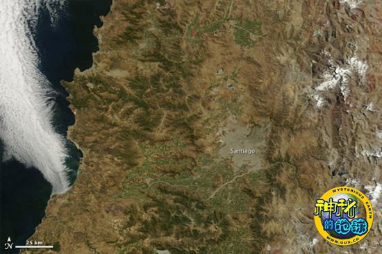 据美国宇航局官网报道,2010年2月27日智利发生了8.8级强震。强震发生后,智利首都圣地亚哥城区上空迷漫着一层薄雾和黑烟。美国宇航局“Terra”卫星上的中分辨率成像光谱仪于国际标准时间2月27日14时25分(北京时间2月27日22时25分)捕捉到这一画面。