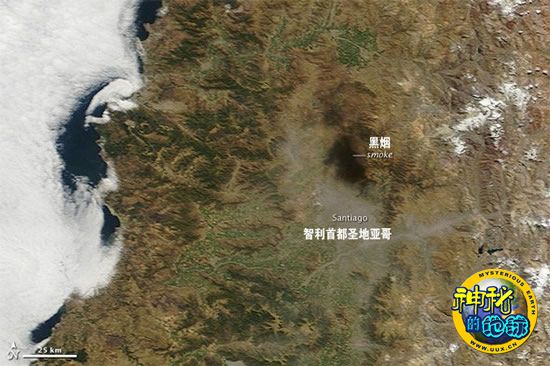 在智利发生地震约8小时后,美国卫星照片显示智利首都上空出现的黑烟。