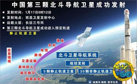 今年1月17日,我国在西昌卫星发射中心用“长三丙”运载火箭成功将第三颗北斗导航卫星成功送入预定轨道,标志着北斗导航卫星系统工程建设又迈出重要一步。此前我国已成功发射四颗北斗导航试验卫星和两颗北斗导航卫星。按照规划,北斗卫星导航系统将相继发射5颗静止轨道卫星和30颗非静止轨道卫星,建成覆盖全球的北斗卫星导航系统。