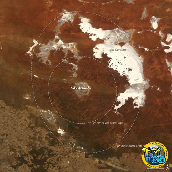 亚克拉曼湖位于澳大利亚贫瘠的内陆地区,是一个较小、较浅的咸水湖。从这张真彩色图片中可以看出,在大片的橙棕色土地上,有数片白色的盐田,这些盐田包括加尔迪内湖和埃弗拉德湖。在图片中还标有两个白色的虚线圈,这种虚线圈代表的是当初亚克拉曼撞击结构可能的范围。