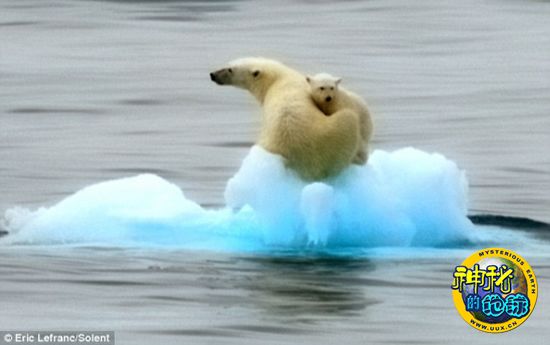 小北极熊紧紧依偎在妈妈怀里,它们挤在狭小的海冰上在大海上漂流