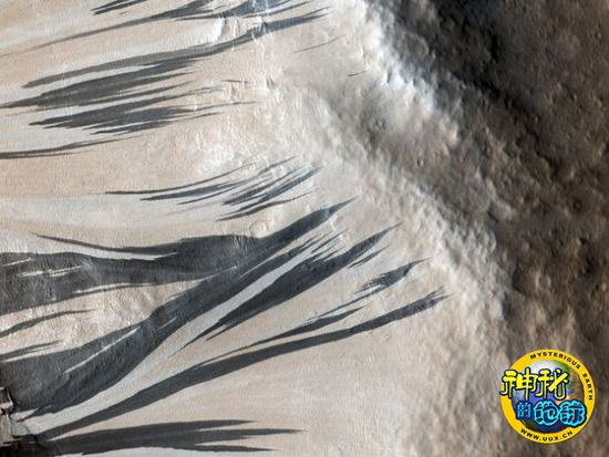 黑色条纹如同神笔留下的神奇印记一样,装饰着火星“阿克伦地沟”(Acheron Fossae)地区的沟槽壁,使得这张照片就像一幅美奂绝伦的抽象画。阿克伦地沟位于火星盾状火山——奥林帕斯山以北620英里(约合1000公里)的地方。这张照片于2010年2月24日公布,是美宇航局火星勘测轨道飞行器捕捉的最新照片之一。这种黑色条纹被认为是某一种地质进程目前在火星上十分活跃的证据。科学家认为,当干燥沙子和细粒尘埃像雪崩一样从斜坡上疾速滑落,露出下面的黑色物质时,就会形成这样的黑色条纹。