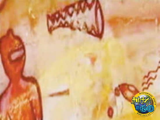 不久前,几位人类学家在印度中央邦的偏远山区发现了这个隐秘的山洞,而洞中墙壁上的远古岩画和符号让专家们为之震惊。一个身穿宇航服的人形生物清晰可见。红色的宇航服和头盔让人不禁联想到日本科幻片《恐龙特级克赛号》里的大英雄。除了外星人,画上还有一个飞行的碟状物体,其上面还有一个圆顶,和我们如今偶尔发现的UFO何其相似!