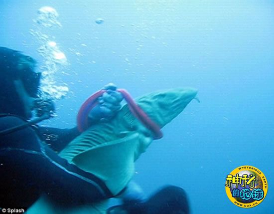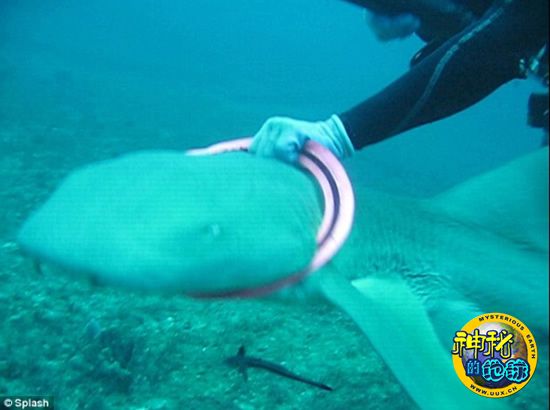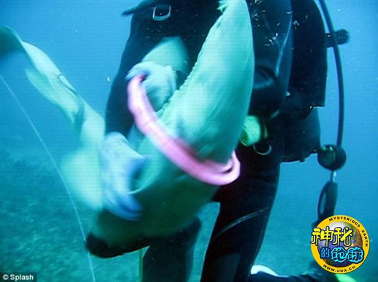 加伯尔抓住套在鲨鱼脖子上的飞盘。被套的鲨鱼看上去非常虚弱。