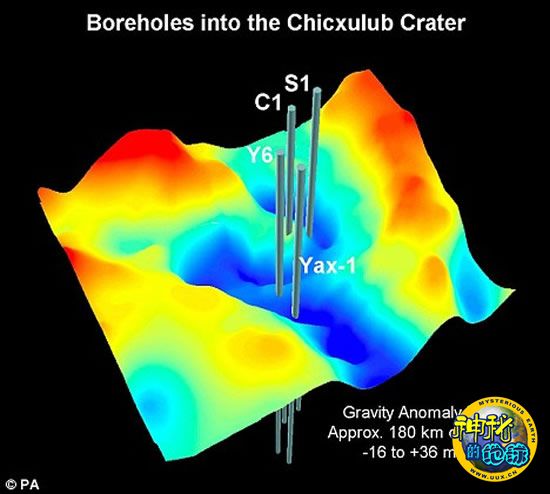 证据:一张图表揭示了希克苏鲁伯陨石坑的重力图,这是那颗巨大的小行星与地球的相撞点。陨石坑显示了受震石英和其他撞击证据