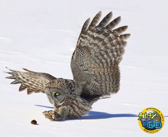 大灰猫头鹰长着一张奇特的脸,好似雷达抛物面天线反射镜,帮助它探测猎物的行动,即使雪下的动作也不放过