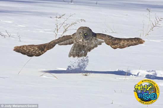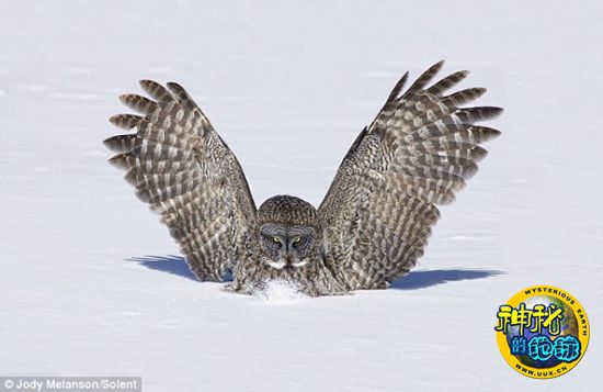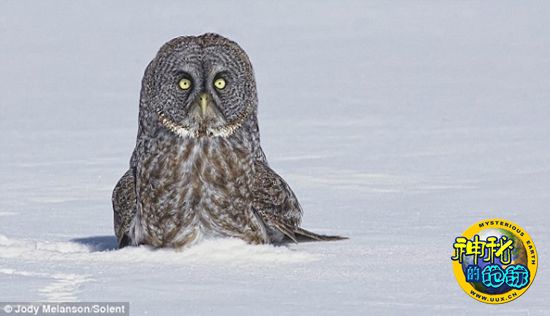 这些照片拍摄于加拿大安大略的鲍勃卡基恩。随着温度降至零下15摄氏度,这只大灰猫头鹰会一直留在树上,俯视这片雪地。在得知大灰猫头鹰在这片雪地出没后,47岁的摄影师乔迪·梅朗森用了一小时来到这里,拍摄了这些难得一见的照片。