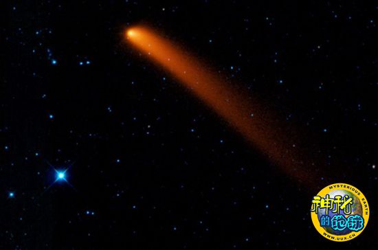 资料图:广域红外探测器使许多可见光望远镜无法观测到的星体显示庐山真面目,这是其所观测到的一颗有1600万公里长慧尾的彗星。