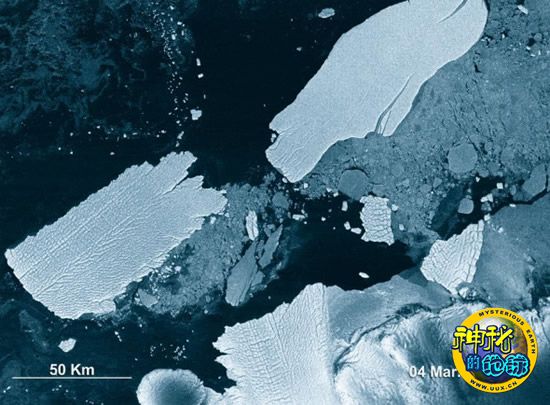 据美国《连线》杂志报道,欧洲航天局“ENVISAT”环境观测卫星上装载的综合孔径雷达拍摄到了南级巨大的冰山相撞的图片。