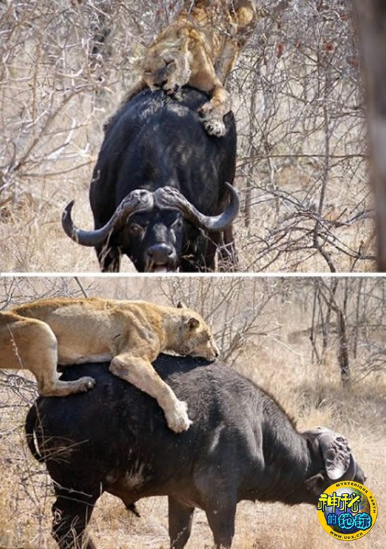 图中这一激烈的搏斗场面发生于南非克鲁格国家公园之中,一只饥饿的雌狮正在对一头健壮的水牛发起进攻。雌狮跳上水牛的背部,用锋利的爪子死死抓住水牛,然后用尖利的牙齿不断撕咬水牛的肌肉。体形大于雌狮数倍的水牛当然不愿意束手就擒,它也在疯狂地上下跳动,希望能够将雌狮甩下去以逃脱被捕杀的命运。但是,饥饿的雌狮更不会轻易放掉已经送到嘴边的猎物。后来,它们的战场转移到公园旁边的一条公路上,甚至造成了当地的交通堵塞。最后,在堵塞的汽车长龙的帮助下,这头已被咬得体无完肤的水牛终于逃过一劫。