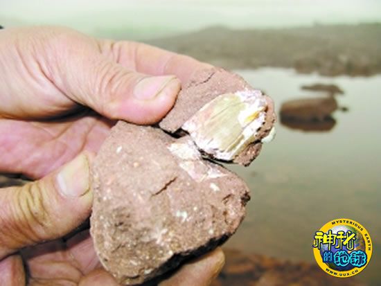 昨天,记者请赵灿辉、地质与古生物专家张显球一同到发现地探访,只见这里四面山水环绕、不见一户人家。“这里有典型的红砂岩。”张显球解释说,这种岩石的特点之一就是呈泥质、砂质。赵灿辉指着一处小山包,说这就是化石的发现地。轻轻敲开松散的岩块,记者一行居然还发现了一些布满花纹的蛋壳片。“这是恐龙的蛋壳。”张显球说,蛋壳表面粗糙,而且有比较规则的粒状纹路,基本可以断定是霸王龙等肉食类恐龙的蛋片。