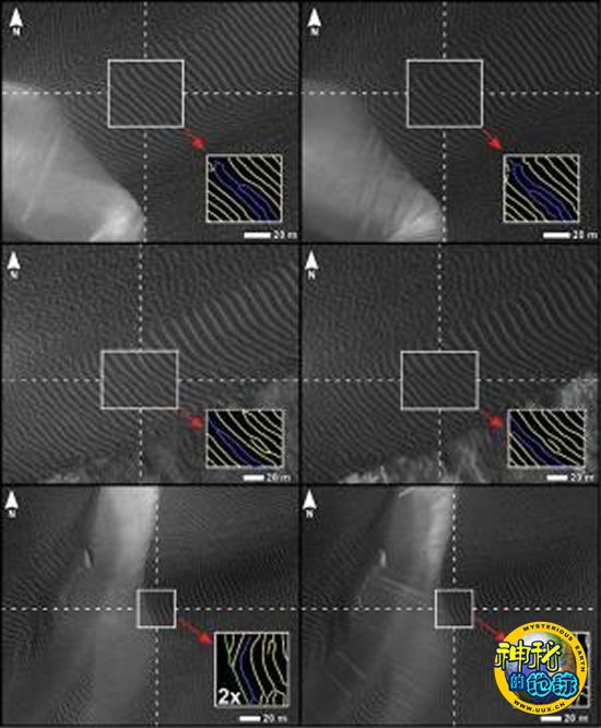 本图展示的是HiRISE拍摄到的火星尼里·帕特拉地区沙丘条纹变化比较图