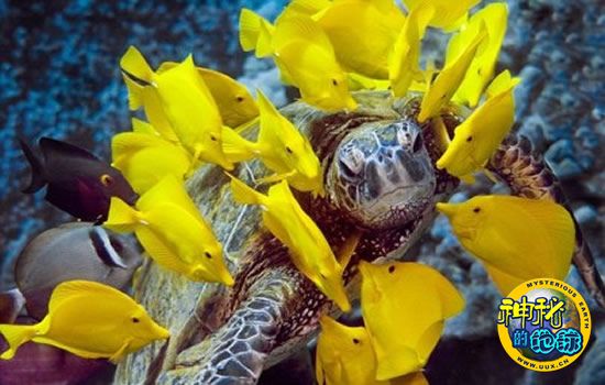 一群鱼围着一只海龟,为它啄去身上的“脏东西”。