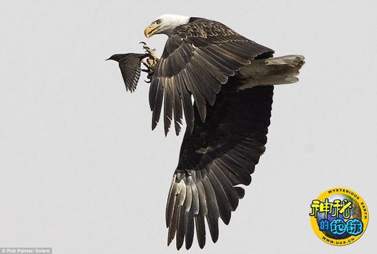 在美国科罗拉多州,摄影师罗布·帕尔默用镜头记录下白头鹫空中追杀星椋鸟的精彩瞬间。在被饥饿的白头鹫选定为自己的盘中餐之后,小小的星椋鸟只能接受死亡的命运。