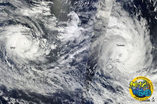 据美国宇航局官网报道,2010年3月中旬,两股强热带气旋形成于南太平洋之上。2010年3月15日,美国宇航局“Terra”卫星和“Aqua”卫星分别捕捉到这两股强热带气旋在南太平洋上空肆虐的情景。