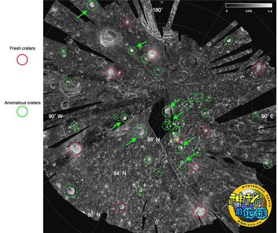 微型SAR雷达勘测月球北极图像,陨坑圈绿色部分包含着冰冻水沉积层