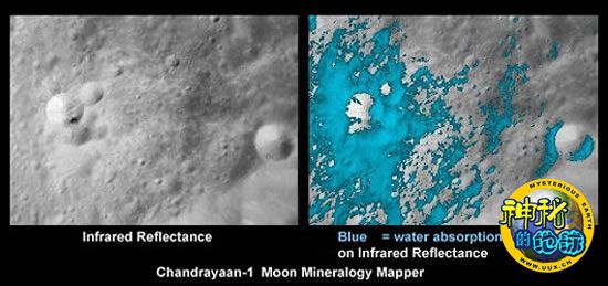 月球矿物绘图仪绘制的伪色彩对比图,蓝色部分显示月球年轻陨坑中有大量含水物质