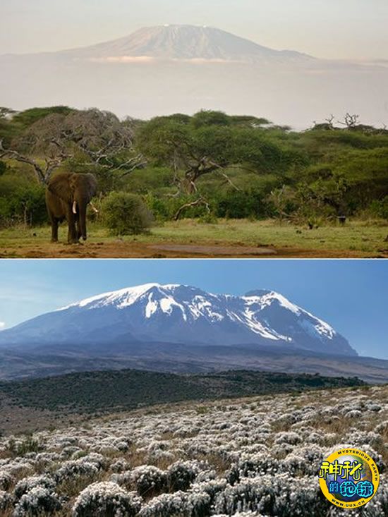 专家称,如果乞力马扎罗山山顶的冰川因全球气候变化而消失,这座位于坦桑尼亚的非洲最高峰不久可能会创造新低。上图摄于2009年,下图摄于2003年。根据2007年公布的一项研究结果表明,乞力马扎罗山的积雪可能并没有像科学家所担心的那么快屈服于全球气候变暖。该研究将乞力马扎罗山冰原面积减少归咎于非洲降雨量下降——“世界水日”的组织者警告称,由于淡水资源有限,非洲降雨量减少可能会影响非洲人的健康。美国俄亥俄州立大学冰川学家郎尼-汤普森(Lonnie Thompson)在2009年11月表示,乞力马扎罗山的冰原面积“在未来二十年会如科学家估计的那样不断减少,直至最终消失。”