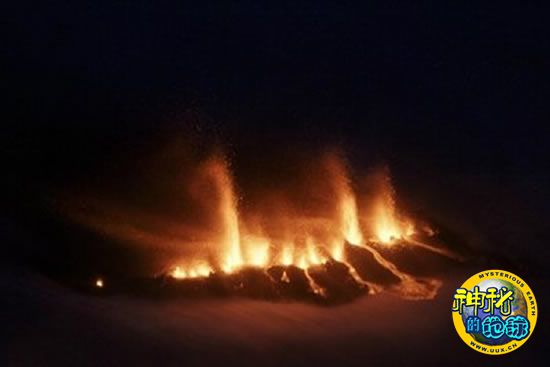 3月21日,火山口喷出滚滚浓烟和炽热岩浆,冲向大约1000米处高空