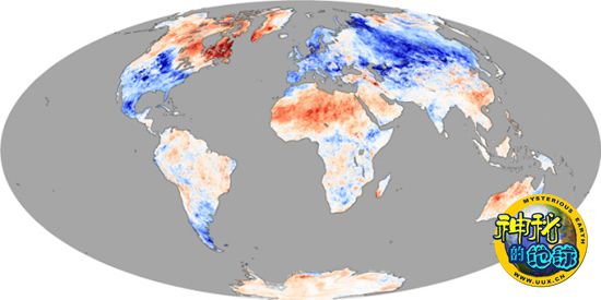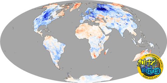 美国宇航局“Terra”卫星上的中分辨率成像光谱仪根据观测数据分别绘制了2009年12月、2010年1月以及2010年2月全球陆地地表温度变化对比图,图片显示了2009-2010冬季北半球陆地地表温度异常情况。在这几幅地图中,对比的目标分别是2009年12月、2010年1月以及2010年2月这三个月的当月平均温度与2000年到2008年共8年间同期平均温度。图中蓝色区域表明当月温度低于2000年到2008年同期平均温度12摄氏度以上;白色区域表明当月温度接近2000年到2008年同期平均温度;而红色区域表明当月温度高于2000年到2008年同期平均温度12摄氏度以上;