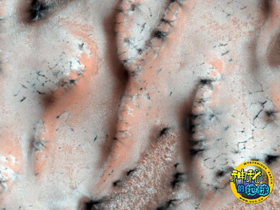 三月精彩太空照片:宇宙蝙蝠 来源: 神秘的地球 时间:2010年4月02日 11:01 2. 火星上的春天 火星上的春天 3月23日,火星上春季已经到来,覆盖北极地区沙丘的干冰开始消失。在春天,干冰升华(从固态直接变成气态)导致了一系列奇特的火星现象的发生。在这张图片上,黑色玄武岩沙砾条纹显露出来,形成扇形结构。这些扇形结构方向相近,这表明它们形成于同一时间,风向和风速都相同。这些扇形结构通常形成于沙丘和地表的分界线。 上一页12345678910下一页 上一篇 下一篇