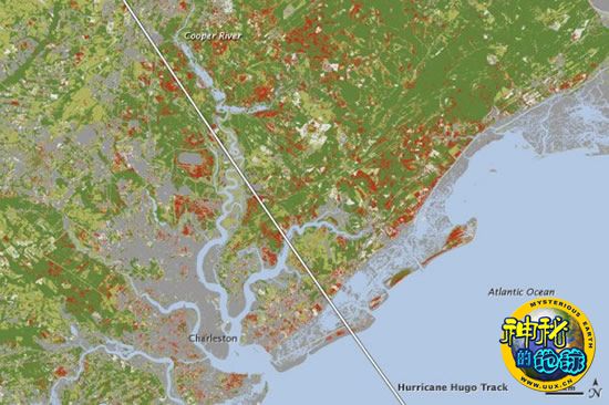 本图显示了1989年“雨果”飓风对美国南卡罗来纳州的森林破坏情况。南卡罗来纳州也是科学家们此次所调查研究的美国南部五个地区之一。通过将飓风过后的卫星图片与美国宇航局“陆地卫星五号”于飓风之前(1988年)所拍摄的图片进行对比,科学家们识别出未被飓风破坏的森林区(深绿色)以及被飓风破坏的森林区(红色)。图中的亮绿色森林区表示,该地区在“雨果”飓风经过之前已经因为其他因素而遭到破坏,如人类砍伐和森林大火。灰色区域则代表非森林区,如城市和海滩等。