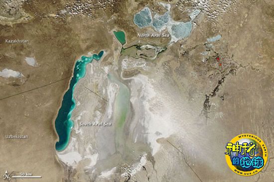 咸海曾经是世界上最大的内陆湖之一。但是,由于前苏联人于上世纪将大量的咸海海水用于农业灌溉项目,进入20世纪后半叶,咸海开始呈现戏剧性的快速萎缩。到21世纪初,咸海萎缩的进程仍在继续。随着水位的下降,咸海自然分成了南咸海和北咸海两片水域,而其中南咸海部分又进一步分成了东、西两部分。北咸海上的大坝起到了保持水位的作用,但是南咸海上同样的大坝却导致了水位的持续下降。在本图中,北咸海表面呈现斑驳的亮白色,那是因为水面之上覆盖一层薄冰,进入春季后仍未完全融化。