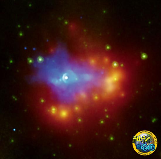 这张由钱德拉X射线天文台和斯皮策太空望远镜最新观测到的图片,显示了一颗崩塌恒星的遗骸。图片中,钱德拉X射线天文台观测到的X射线呈现蓝色,而红色和黄色区域是由斯皮策太空望远镜观测的。科学家认为,图中央的脉冲星发出高能粒子流,加热了超新星爆炸所产生的尘埃遗骸。