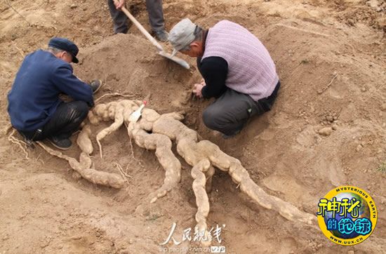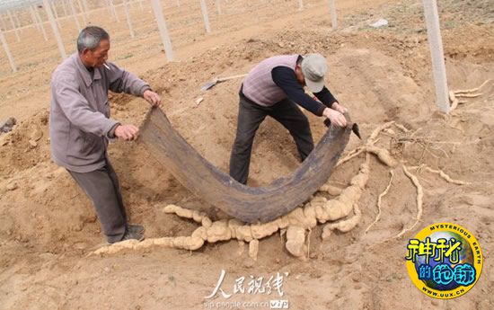 河南安阳发现4米多长巨型天花粉 来源: 神秘的地球 时间:2010年4月06日 14:24 河南安阳发现4米多长巨型天花粉 河南安阳发现4米多长巨型天花粉 河南安阳发现4米多长巨型天花粉 2010年4月2日,河南安阳栝楼种植开发示范基地工作人员在采挖天花粉时,刨出一长约4.1米,重约150多斤的特大天花粉。其重量之大,形态怪异,颇似鳄鱼,令人称奇。据该基地有着丰富栝楼种植经验的杨保成介绍,天花粉是一种中药材,主产于河南、河北、山东等地,目前在国内尚未发现过如此大的天花粉。 人民图片网 常中正 摄影 上一篇 下一篇 TAG: 天花粉