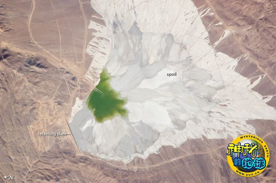 从图中的露天矿场到更北区域(图片中未显示),所挖掘出来的矿物大部分都是含铜废料。这些含铜废料以液体(图片中央的绿色区域)的形式源源不断地涌入蓄水区,然后干涸于图中颜色较浅的废料区。一条长约1公里的大坝将废料区拦住,图片左下角看到的那条直线就是大坝。