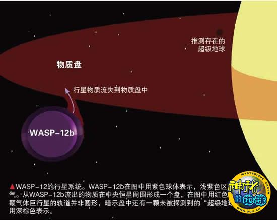 从WASP-12b流失的物质不会直接掉入主星,而是在主星周围形成一个盘,盘旋着缓慢流入主星。对WASP-12b轨道运动的深入分析表明,这个盘中还存在另一颗质量较小的行星在扰动它的轨道。这颗行星很可能是一颗大质量的类地行星——俗称“超级地球”。