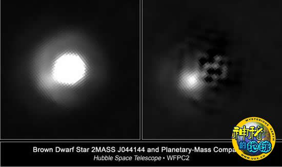 这是哈勃望远镜所拍摄的神秘天体和褐矮星2M J044144,左图中,明亮的褐矮星8点钟方向是神秘的天体;右图中,过滤褐矮星的光线,所呈现出神秘天体的结构