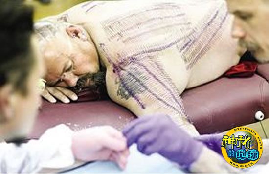 在整个穿刺过程中,布伦斯都没有抱怨过一句疼痛,最多只是眨下眼睛,皱下眉头。当1501枚钢针都插上身后,布伦斯站起来接受媒体拍照,他的双腿终于开始颤抖,剧烈的疼痛让他产生了休克感。
