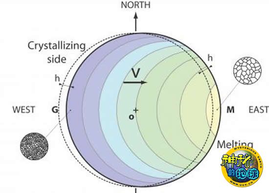 是什么使得地球的核心如此不对称地受到扭曲? 据4月16日的《科学》杂志报道说,这个问题对科学家来说是一个长期存在的谜团,但2项新的研究使人们增进了对在过去的数千年中塑造我们行星的核心的地球动力学过程的了解。 Marc Monnereau及其同僚知道,地球中心的固体的核心会因为在地核外侧的铁的缓慢晶化而发生膨胀,因此他们开始测试数百万个不同的地核增长的模型,其中每一个模型都牵涉到不同大小的铁颗粒。 他们着眼于一个模型:该模型考虑到了来自固态中央核心到液态外侧核心的分子运动;他们证明了这种铁颗粒的传送是如何导致地核的某一侧的铁的永久性晶化,以及在其对侧所发生的铁的持续性的熔化。 研究人员的这一模型恰好显示,为了创制一个我们现在所经历到的不均衡的地核,这种地球深部缓慢的铁分子移动是如何导致了熔化中的东半球以及一个固态的西半球。 由于该过程仍然还在继续进行,这一研究还支持地球内核的龄期相对较为年轻的理论。
