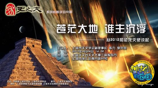 上海天文台和上海市天文学会共同组织的“天之文系列科普讲坛”本周末进行第二讲。此次将由上海市天文学会副理事长陈力研究员主讲,主题是:“苍茫大地,谁主沉浮-从2012和恐龙灭绝谈起”。此外,上海市启明星天文爱好者联盟还将发布“2010年5月观星指南”。欢迎广大市民和天文爱好者关注。此次论坛采取电话预约方式,请有兴趣参加的朋友请提前电话预约64386191-223(虞老师),以便安排。
