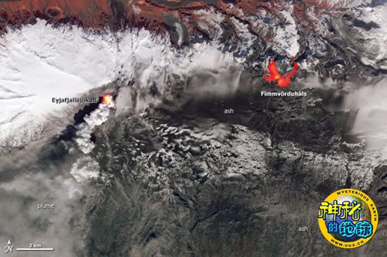 先进星载热辐射与反射辐射计是根据来自火山的热红外辐射的能量进行记录和标记的。本图片的其余部分则是利用可见光和近红外线图像合成而得。在图片顶部,有一片呈深红色的区域,那里是马尔卡夫河谷中的植被覆盖的地区,来自艾雅法拉冰帽的蓝色溪流最终都汇入马尔卡夫河。在艾雅法拉火山的北方和正西方,那里的冰体最原始,仍保持洁白的面貌。但在东方和南方,冰雪之上则覆盖了一层厚厚的深色火山灰。火山之上升起的白色羽状物可能是蒸汽和火山灰的混合物。