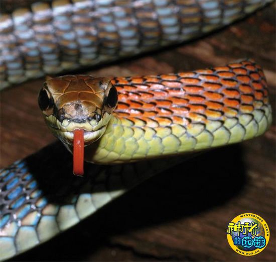 绿黄相间的鼻涕虫是在马来西亚沙巴地区海拔1900多米的山区森林中发现的。鼻涕虫用尾巴运动,它的尾巴比头长两倍,而头被4厘米长的身体缠住,看起来就像一只宠物猫。火焰蛇(柯普斯坦氏过树蛇)体长约1.5米,其颈部是鲜艳的橙色,并伴有彩虹色、蓝色、绿色以及褐色条文,一直延伸到身体后背上。