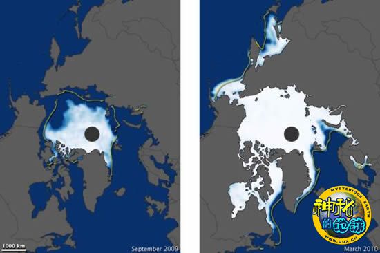 这两幅图揭示了北极海冰的显著变化。左图显示的是2009年9月时北极海冰的最小范围,而右图显示的是2010年3月时北极海冰的最大范围。在两幅图中,灰色地带表示陆地,深蓝色区域表示没有海冰的海洋,而白色区域则表示海冰覆盖的区域,同时白色也代表了海冰的密度,密度越大,白色越纯。图中的黄线则表示1979年至2000年间当月观测数据的平均值。图片是根据美国宇航局“Aqua”卫星上的日本制造传感器“先进微波扫描辐射计”(AMSR-E)的观测数据绘制而成。