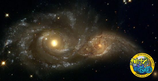 哈勃空间望远镜拍摄到相互作用星系对NGC 2207(左)和IC 2163。它们位于大犬座,离地球约1.14亿光年。图中可见在NGC 2207强大引力产生的潮汐力作用下,IC 2163的恒星和气体等物质已向右端冲去。IBM的研究人员对这两个星系的交会作了计算机模拟,表明IC 2163没有足够的能量从其对手的引力魔爪下挣脱出来,几十亿年后将并合成一个单一的、质量更大的星系。