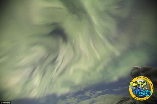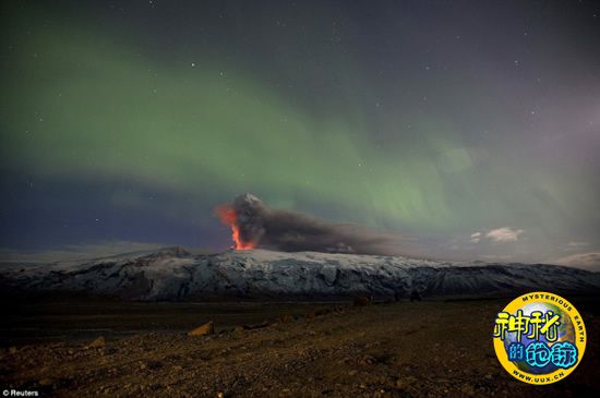 冰岛上空火山与北极光交相辉映
